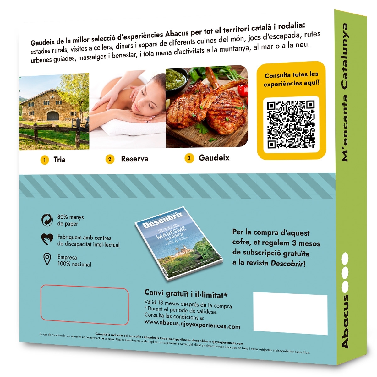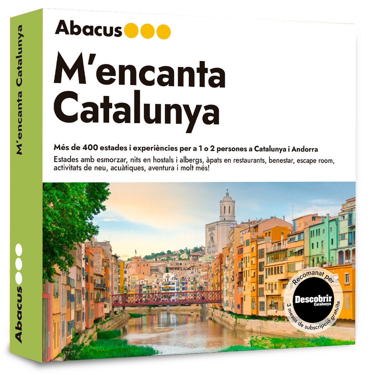 Gaudeix de la millor selecció d’experiències Abacus per tot el territori català i rodalies: Estances rurals, visites a bodegues, dinars i sopars de diferents cuines del món, escape rooms, rutes urbanes guiades, massatges i benestar i tot tipus d’activitats de muntanya, al mar o a la neu.