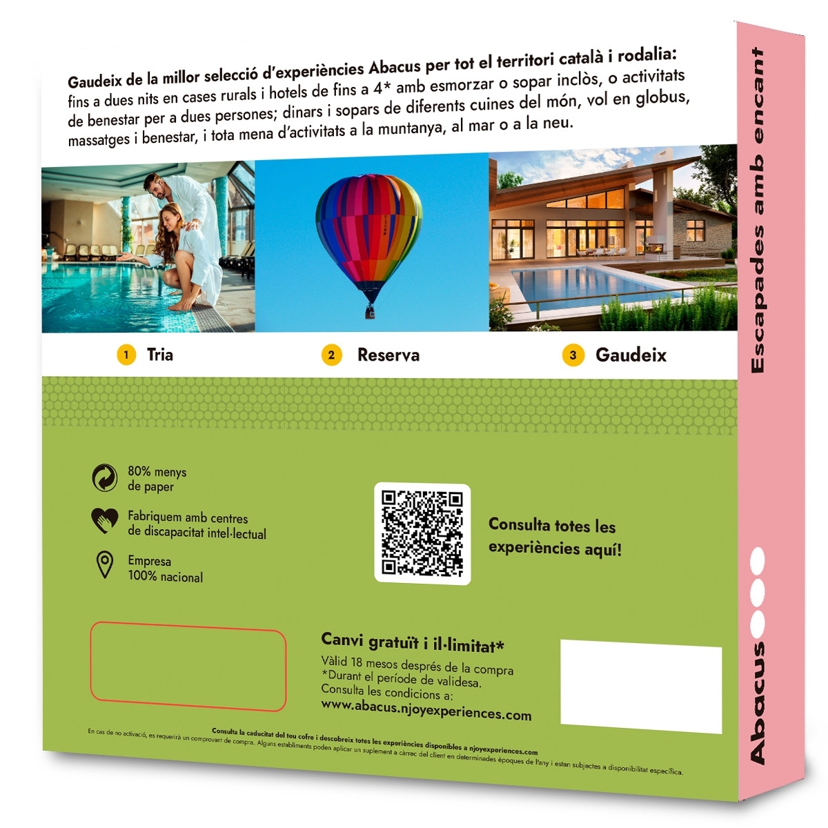Gaudeix de la millor selecció d’experiències Abacus per tot el territori català i rodalies: Fins a dues nits en estances en cases rurals i Hotels fins a 4*amb esmorzar i/o sopar inclòs o activitat benestar per a dues persones. Dinars i sopars de diferents cuines del món, vol en globus, massatges i benestar i tot tipus d’activitats de muntanya, al mar o a la neu.