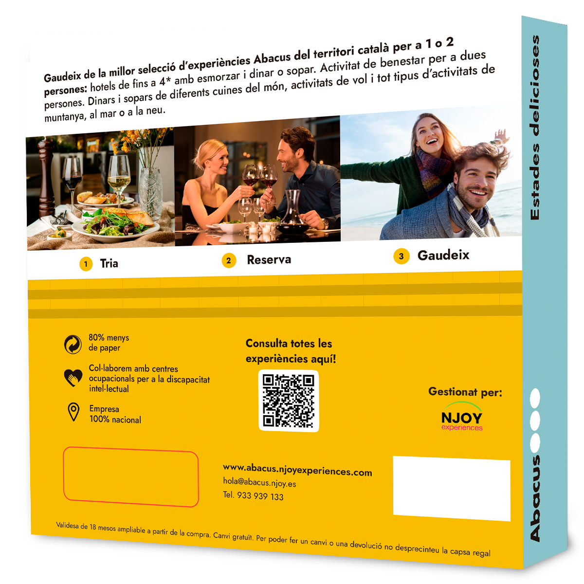 Gaudeix de la millor selecció d’experiències Abacus per tot el territori català i rodalies: Fins a dues nits en estances en cases rurals i Hotels fins a 4*amb esmorzar i/o sopar inclòs o activitat benestar per a dues persones. Dinars i sopars de diferents cuines del món, vol en globus, massatges i benestar i tot tipus d’activitats de muntanya, al mar o a la neu.