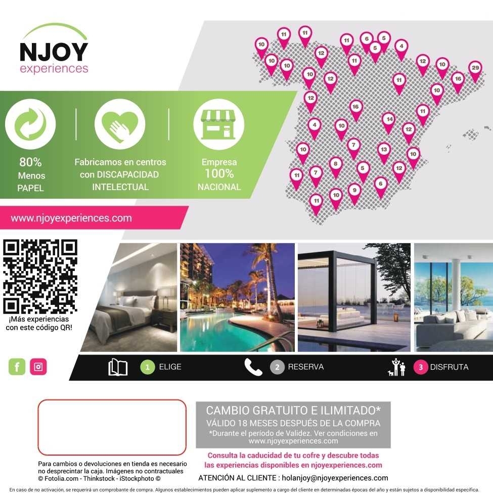 NJOY Experiences te propone "Mil y una Escapadas PREMIUM" en pareja. Disfruta de un fin de semana de desconexión total, una escapada romántica con cena, una estancia relajante con circuito spa o una divertida estancia familiar en la naturaleza en hoteles hasta 4* en España y Andorra. ¡Para todos los gustos!