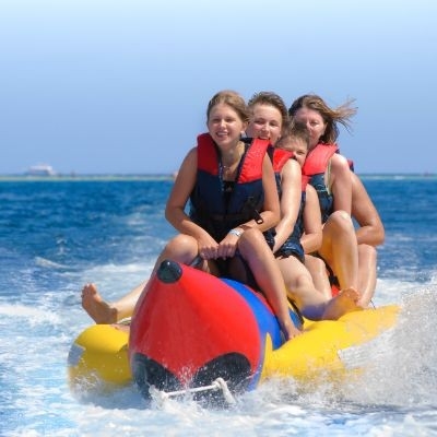 En nuestro nuevo barco banana, podemos tomar a grupos de hasta 10 personas. El viaje durará aproximadamente 15 min, alrededor de la bahía de Benidorm. Usted puede unirse a este viaje desde, Levante o Poniente. Cualquiera puede participar en este emocionante viaje, pero debe ser capaz de nadar. Los chalecos salvavidas y cascos se proporcionan por supuesto para su seguridad personal.